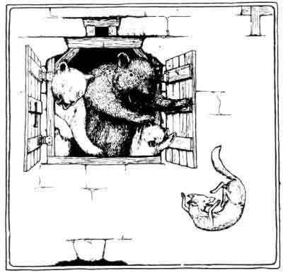 Once upon a time, there were three Bears who lived in a castle in a great wood. One of them was a great big Bear, and one was a middling Bear, and one was a little Bear. And in the same wood there was a Fox who lived all alone, his name was Scrapefoot. Scrapefoot was very much afraid of the Bears, but for all that he wanted very much to know all about them. And one day as he went through the wood he found himself near the Bears' castle, and he wondered whether he could get into the castle. He looked all about him everywhere, and he could not see anyone. So he came up very quietly, till at last he came up to the door of the castle, and he tried whether he could open it. Yes! the door was not locked, and he opened it just a little way, and put his nose in and looked, and he could not see anyone. So then he opened it a little way farther, and put one paw in, and then another paw, and another and another, and then he was all in the Bears' castle. He found he was in a great hail with three chairs in it -- one big, one middling, and one little chair; and he thought he would like to sit down and rest and look about him; so he sat down on the big chair. But he found it so hard and uncomfortable that it made his bones ache, and he jumped down at once and got into the middling chair, and he turned round and round in it, but he couldn't make himself comfortable. So then he went to the little chair and sat down in it, and it was so soft and warm and comfortable that Scrapefoot was quite happy; but all at once it broke to pieces under him and he couldn't put it together again!